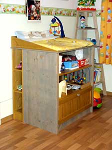 Rechts sehen sie einen Kleiderschrank und eine Wickelkommode. Diese wird später als Spielzeugschrank genutzt .